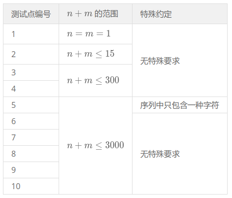 对于所有测试点,有 $0 \lt B \lt A≤1000,−1000≤d(x,y)≤1000,d(x,y)=d(y,x)$,序列只包含 $\{A,T,G,C\}$ 四种字符。