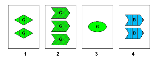 We will use the code {count}{color}{fill}{shape} to specify a SET card. For example, the cards above are: 2GSD, 3GFA, 1GEO, 2BSA. {fill} is one of E, S or F for Empty, Striped or Filled respectively. {shape} is one of A, D or O for Arrow, Diamond or Oval respectively.
